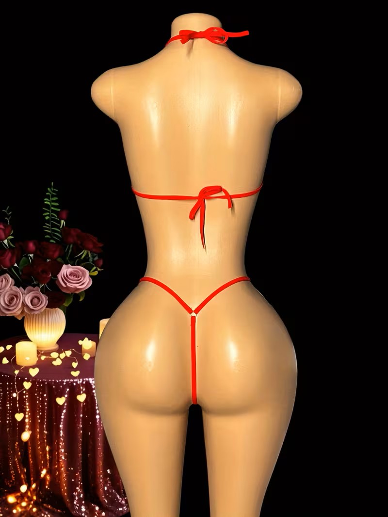 Designed for the bold, fearless woman who knows exactly what she wants, this daring red set features a seductive halter triangle top with delicate tie details and a matching open-crotch thong that leaves little to the imagination. The vibrant red hue screams passion and desire, while the minimal coverage celebrates every curve of your body.